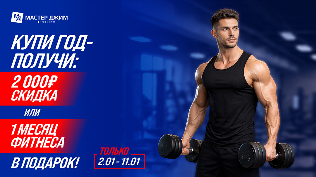 Друзья!Мастер Джим продолжает дарить Новогодние и Рождественские подарки!УСПЕЙТЕ купить годовой абонемент по 11 января и ПОЛУЧИТЕ ПОДАРОК на выбор:СКИДКА 2000₽или1 МЕСЯЦ ФИТНЕСА В ПОДАРОК!«Мастер Джим» - это:- Тренажерный зал с высокими потолками и мощной системой вентиляции;- Более 30 видов групповых программ;- Бассейн;- Студия сайкла;- Студия йоги;- Зал единоборств;- Просторные раздевалки;- Собственная скважина;- Сауна;- Хамам;- Три автопарковки;- Фитнес-бар;- Детская игровая комната;- SPA-салон.Лучше один раз увидеть - приходите на БЕСПЛАТНУЮ экскурсию по Клубу!ВНИМАНИЕ! Количество карт ограничено!Звоните в отдел продаж уже сегодня:т. 245-91-58(ежедневно с 10:00-21:00)